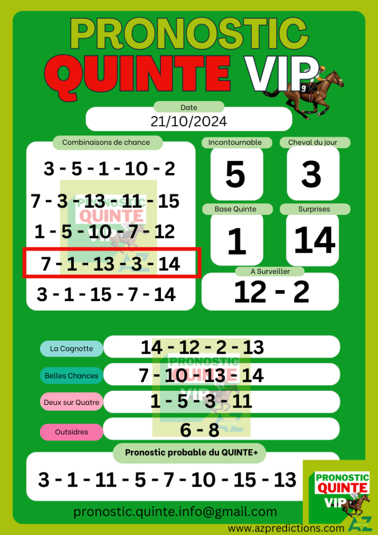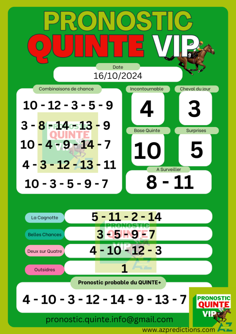 Pronostic Quinté VIP ! Gagné Ordre Aujourd’hui 16/10/2024 de 20 477,00 €. Votre abonnement commence après 24 heures de votre paiement Vous recevrez vôtres pronostics sur votre email pronostic.quinte.info@gmail.com Votre abonnement proposé un pronostic en huit chevaux avec : Le cheval du jour Incontournable Base Quinte Outsidres Couple Le Duo Du Jour 2/4 A suivre Surprises En…