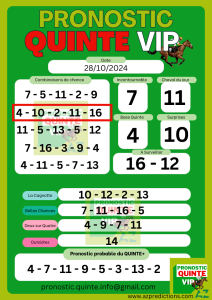 Pronostic Quinté VIP ! Gagné Désordre Aujourd’hui 10/10/2024 de 2 777,60 €. Votre abonnement commence après 24 heures de votre paiement Vous recevrez vôtres pronostics sur votre email pronostic.quinte.info@gmail.com Votre abonnement proposé un pronostic en huit chevaux avec : Le cheval du jour Incontournable Base Quinte Outsidres Couple Le Duo Du Jour 2/4 A suivre Surprises…